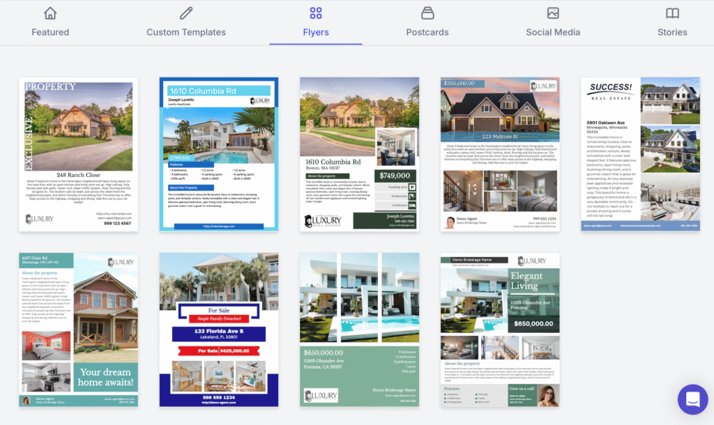 Pre-designed flyer templates are available for high-quality print marketing, commonly used at open houses and listing presentations.